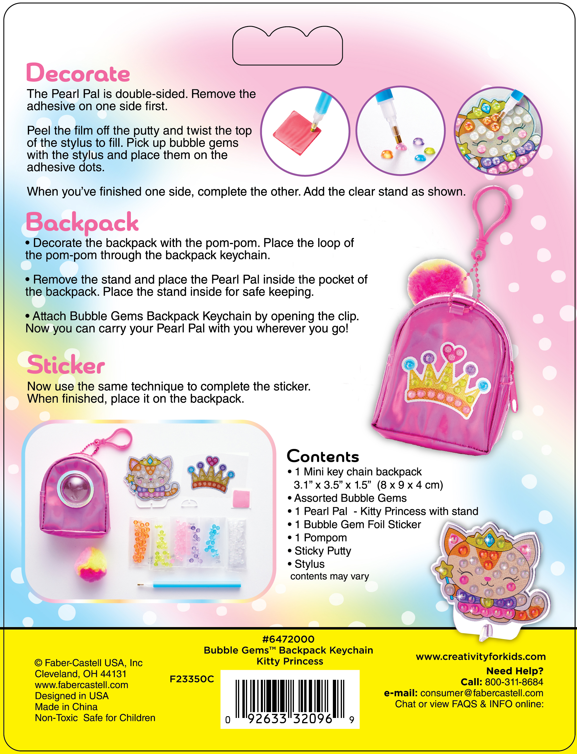 Bubble Gems! Iridescent pearl art that POPS! If your kids enjoy diamond painting, crafting stickers and of course princess kitties, they will love this adorable mini backpack keychain! Featuring a kitty pearl pal that they can create, play with and tote around!