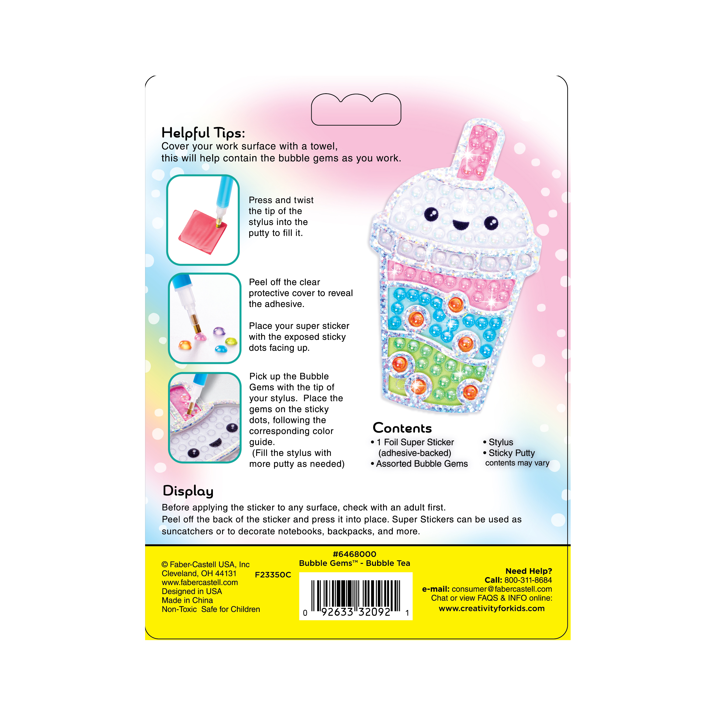 Contents Include: 1 Bubble tea foil super sticker, 300 Assorted color bubble gems, 1 Stylus and 1 Sticky putty square. Instructions included on the packaging