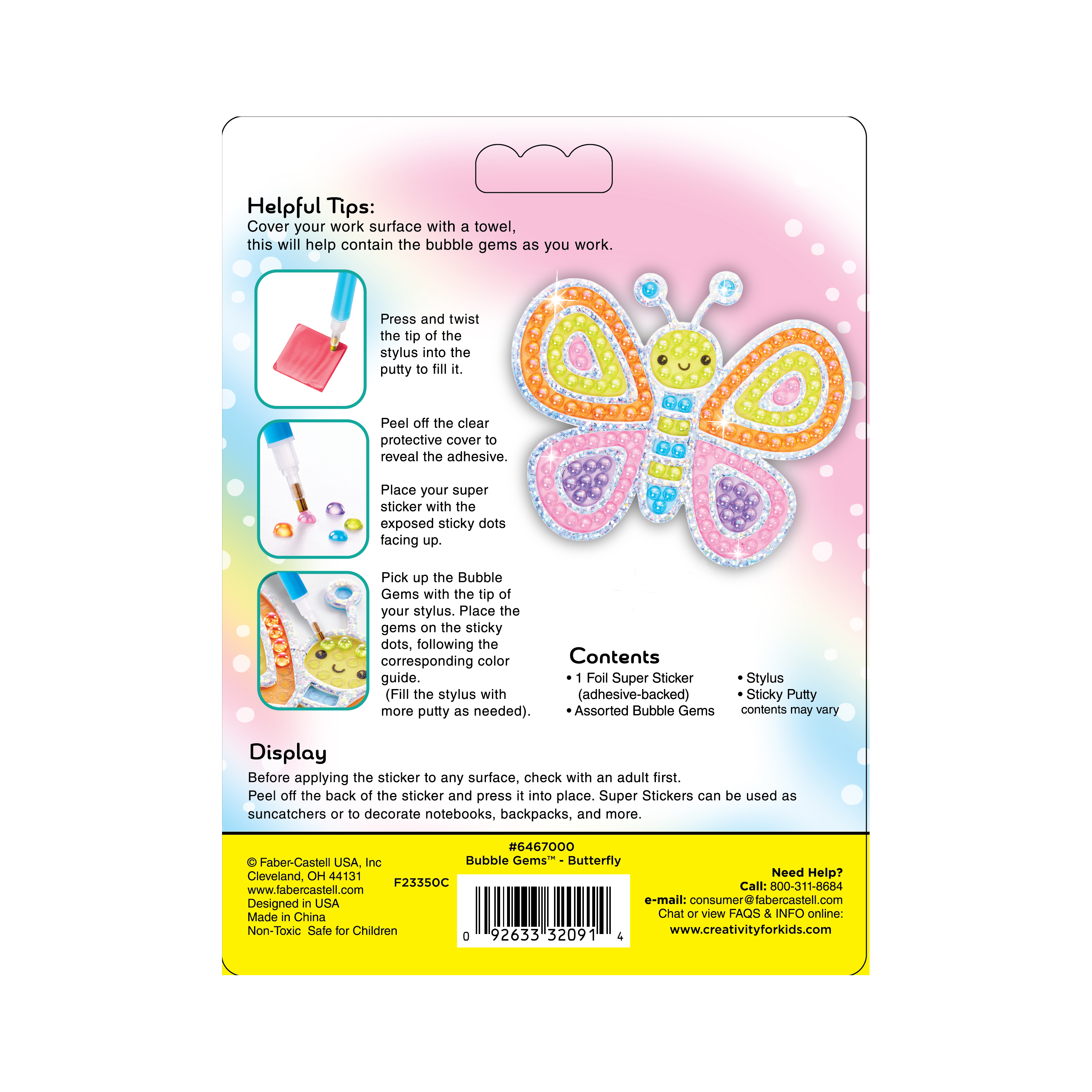 Contents Include: 1 Butterfly foil super sticker, 300 Assorted color bubble gems, 1 Stylus and 1 Sticky putty square. Instructions included on the packaging