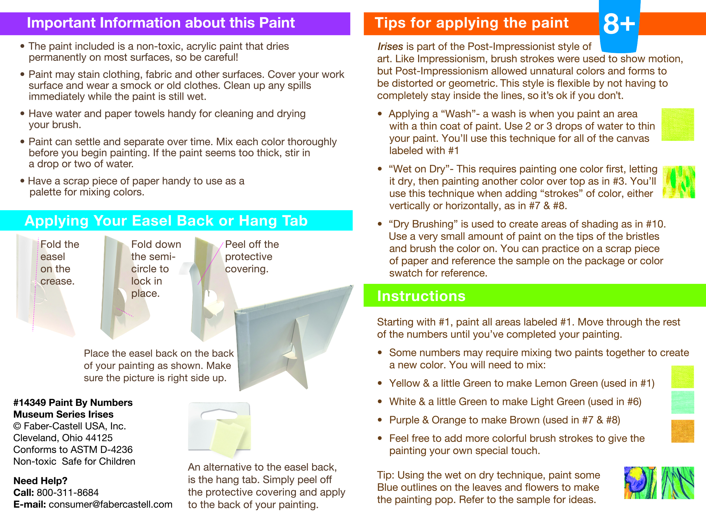 Contents Include: Six 5ml acrylic paint pots- white, purple, dark blue, yellow, green, and orange, #2 brush with Faber logo, Real Canvas board- 6x8" with 1 color printing, hang tab, display easel, number guide and instructions with interesting facts about the art.