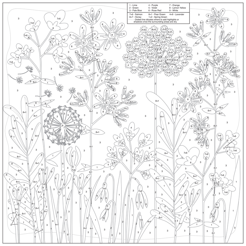 Contents Include: 9 color watercolor palette, Unique color palette for each design, 12" x 12" stretched gallery canvas, Fine point paintbrush, Separate numbered paint guide