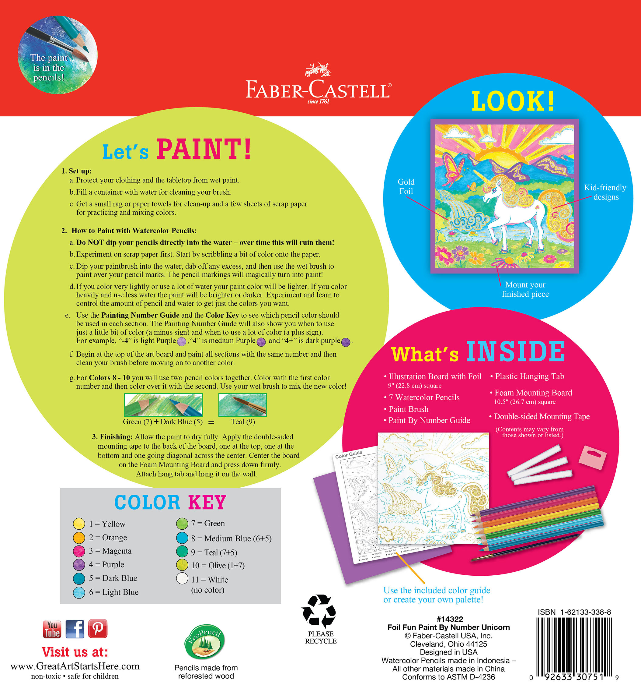 Paint by Number for kids comes with (7) Faber-Castell Watercolor Eco Pencils, pre-printed illustration board (9" square), numbered painting guide, paint brush, foam display and mounting tape.