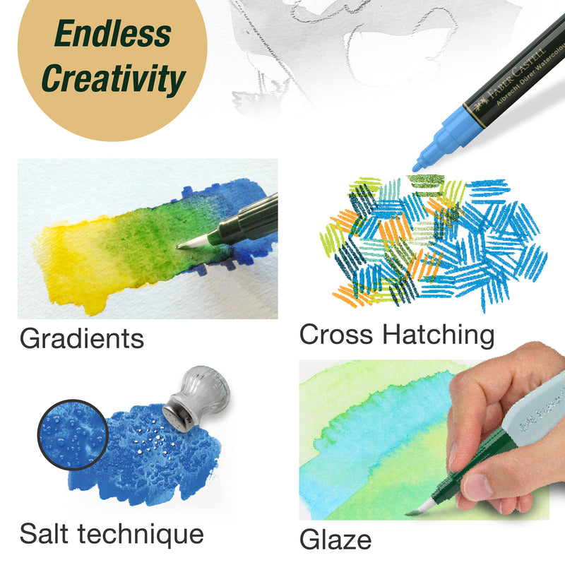 Modern Watercolor Painting: An artist's watercolor marker is the modern definition of watercolor painting. The Albrecht Dürer Watercolor Marker is an absolutely high-quality drawing tool that supports both spontaneous sketching and watercolor painting. The water-based ink is always ready for use and can be mixed with water.